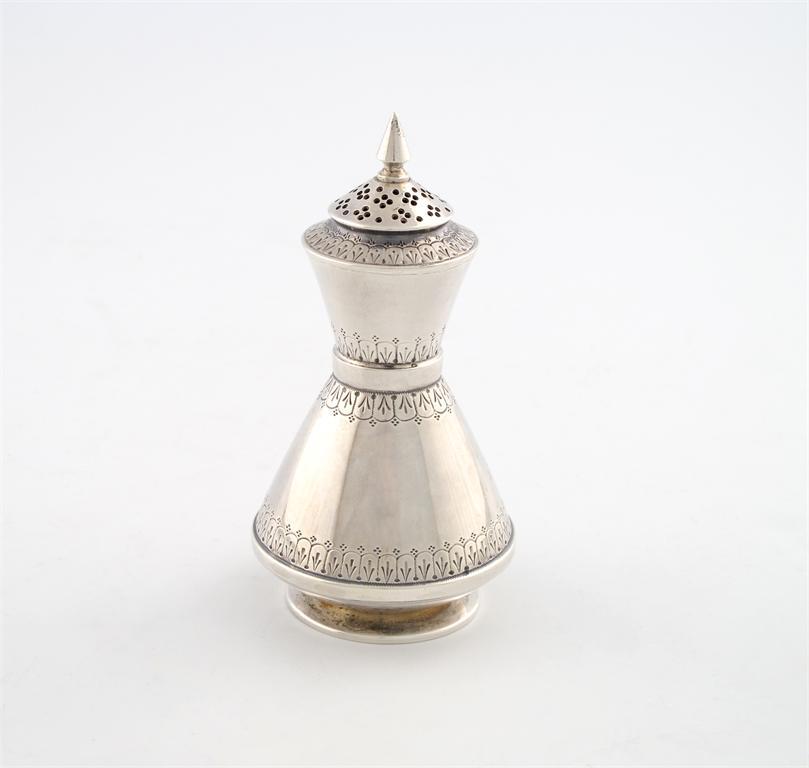 A Victorian silver pepper pot, by The Barnards, London 1873, tapering waisted conical form, pull-off cover, engraved decoration, initialled, on a circular foot, height 10cm, approx. weight 2oz.