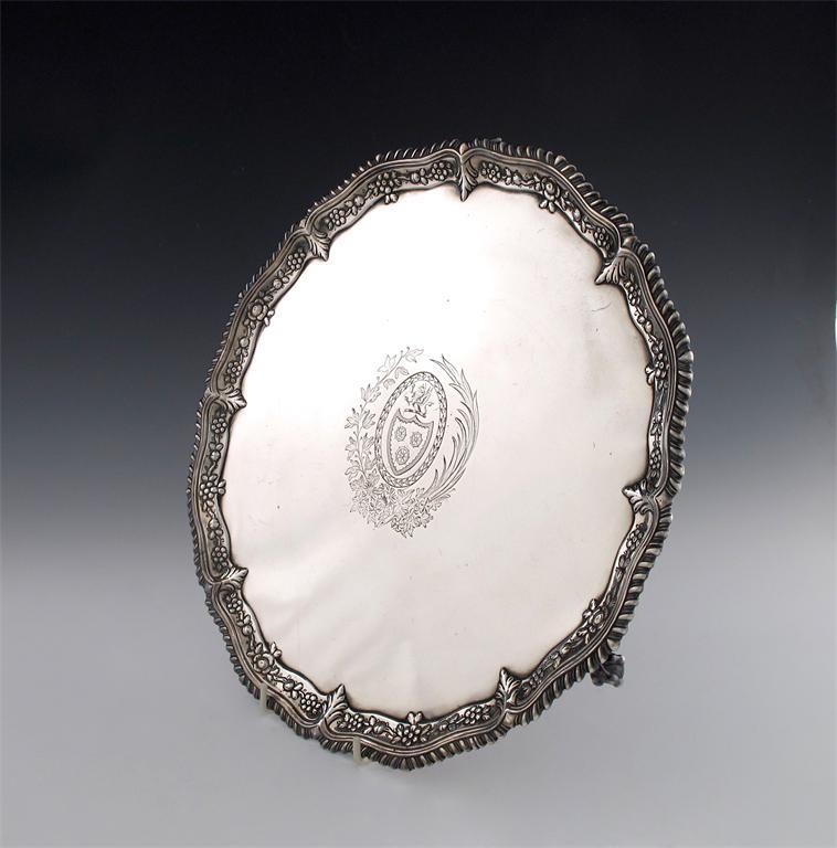 circular form, with a border of foliate decoration and with an outer gadroon border, on three claw and ball feet, the centre engraved with an armorial within foliate mantling, diameter 32.8cm, approx. weight 32oz.