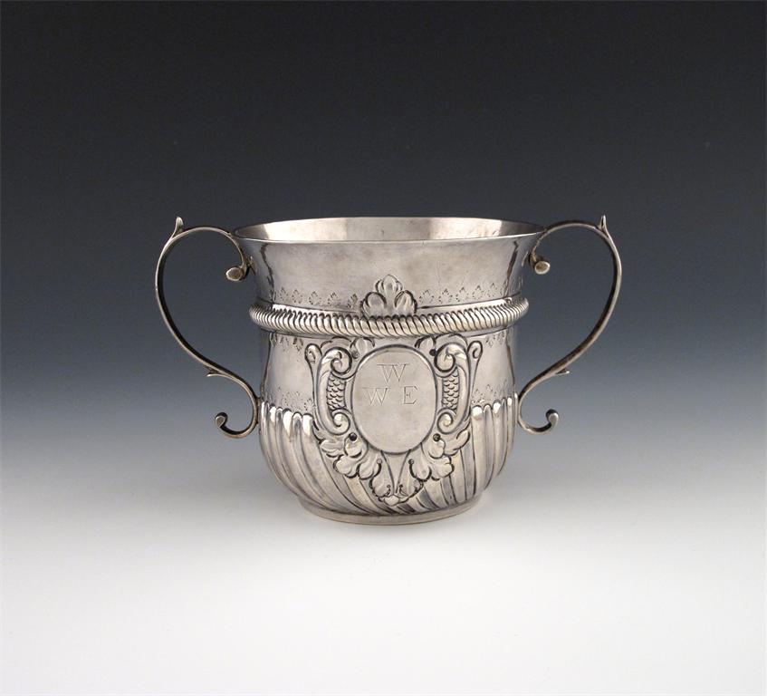circular form, scroll handles, part fluted decoration below a rope work girdle, the oval cartouche scratch initialled 'W' over 'WE', diameter 11.3cm, height 10.2cm, approx. weight 7oz.