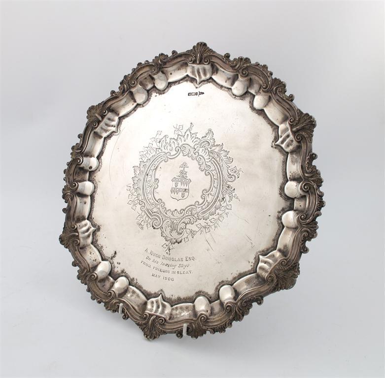 An Edwardian silver salver, by Walker and Hall, Sheffield 1903, circular form, shell and scroll border, the centre inscribed and engraved with an armorial, on four scroll bracket feet, diameter 35.8cm, approx. weight 38oz.