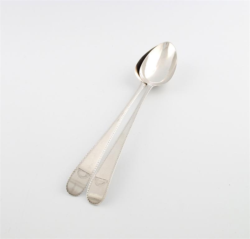 A pair of George III Irish silver Bright-cut pattern basting spoons,