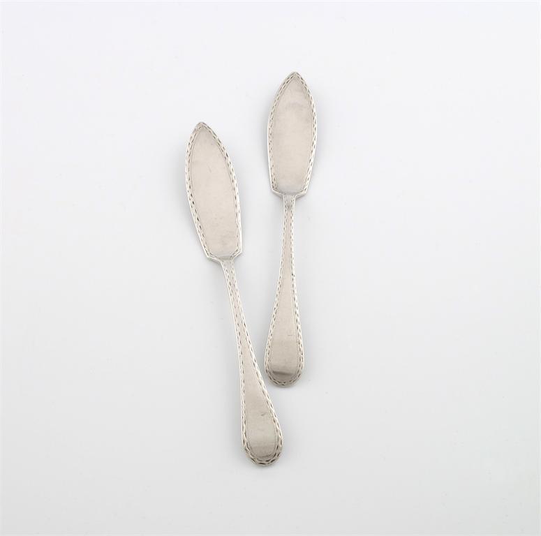 A pair of Victorian Irish silver Bright-cut pattern butter knives