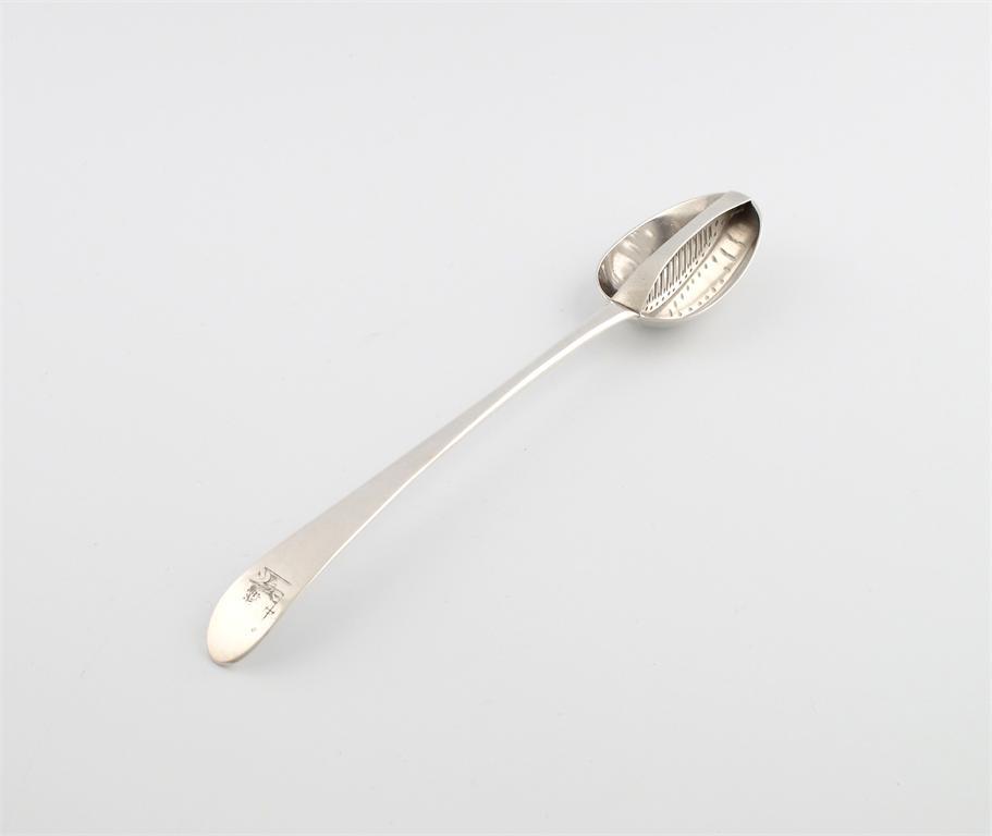 A George III Irish silver straining spoon, over-stamped with maker's mark of Michael Keating, Dublin 1780, the oval bowl with a fixed straining section, the terminal with a crest, length 29cm, approx. weight 3.5oz.