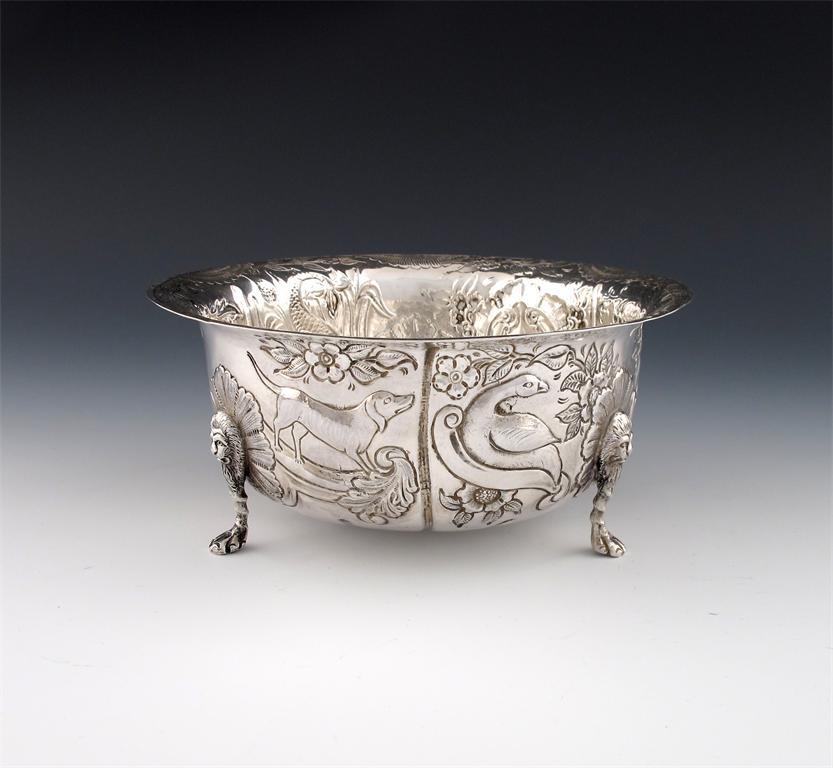 circular form, embossed with dogs, animals and birds within foliate decoration, on three lion mask paw feet, diameter 17.3cm, approx. weight 9oz.