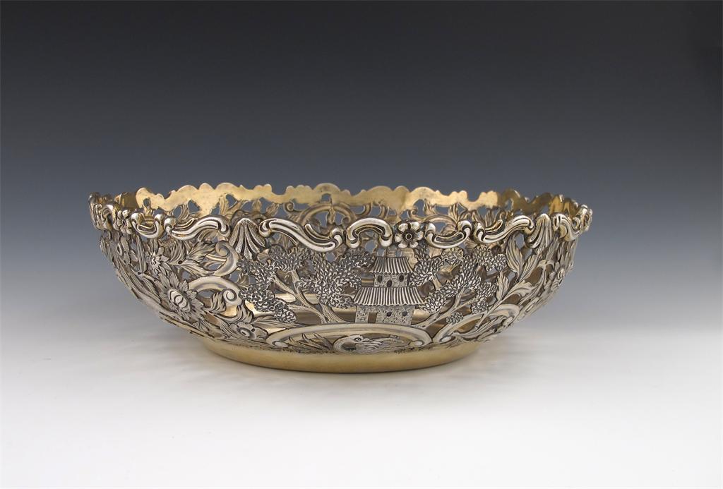 A late-Victorian Irish silver-gilt basket, maker's mark partially worn ?W, Dublin 1898, circular form, embossed and pierced with birds, Chinoiserie and figural scenes and foliate scroll decoration, diameter 26.7cm, appox. weight 23oz.
