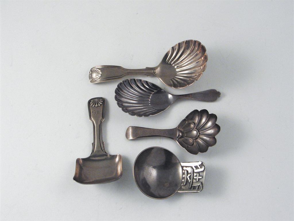 Five assorted caddy spoons, two fiddle, thread and shell examples; another with a stamped pattern in the bowl; a modern fluted example and a modern scoop with characters on the handle, mixed makers and dates, (5).