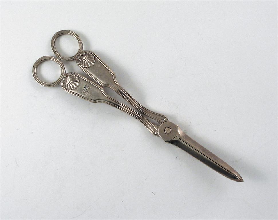 A pair of Victorian fiddle, thread and shell grape shears, (single struck), crested, by Messers J and J Williams, Exeter, 1861, 8in (20.2cm), 3.8oz.