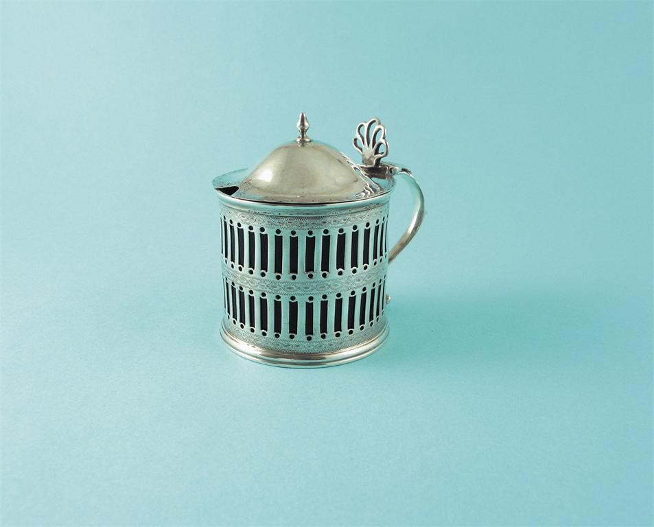 A George III provincial pierced mustard pot, with a blue glass liner, domed cover and knop finial, by John Mitchison, Newcastle c.1780, 3.25in (8.2cm)high, 2.5oz weighable silver.