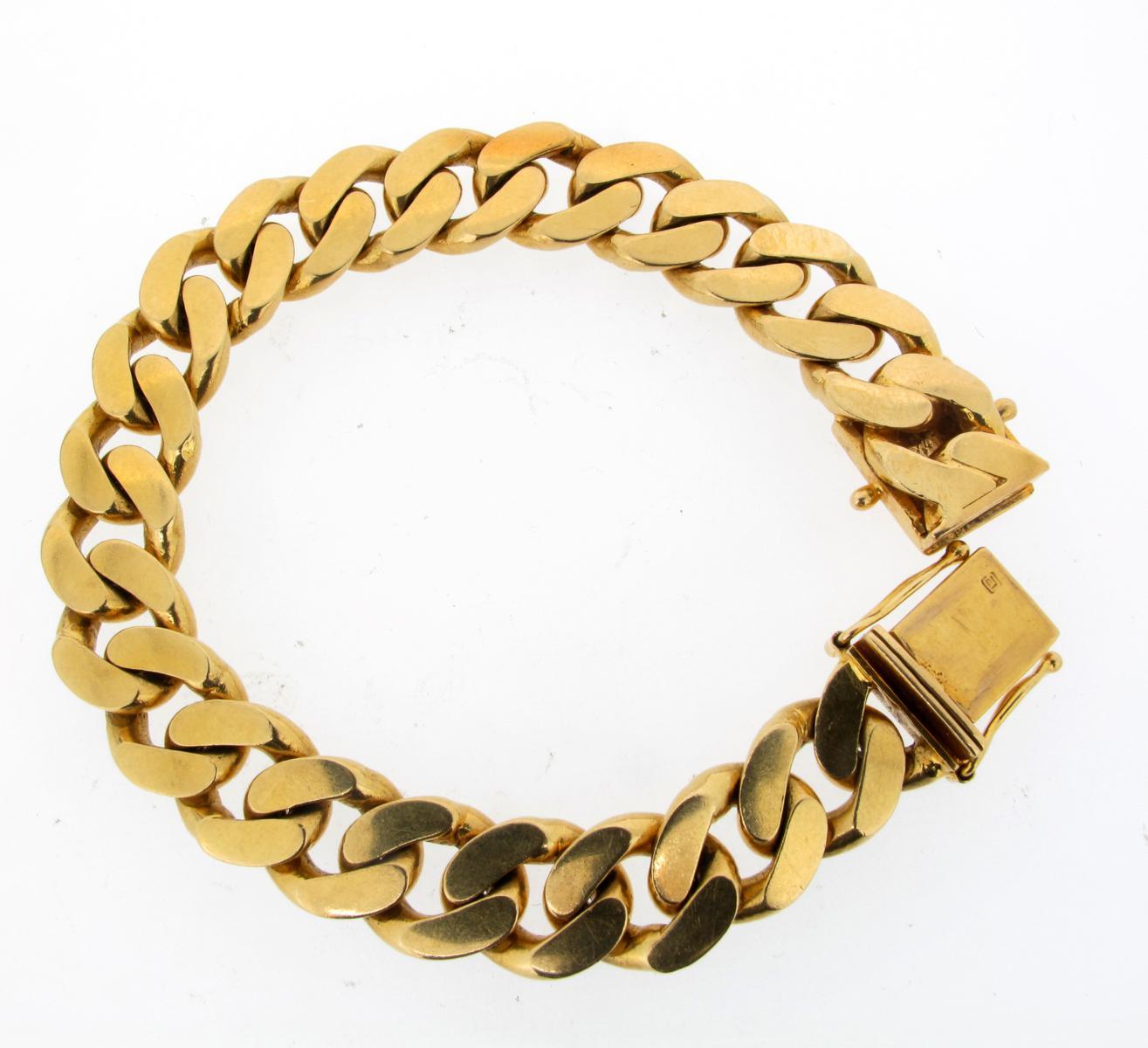 A yellow gold flat curb link bracelet, 21cm. 76g.