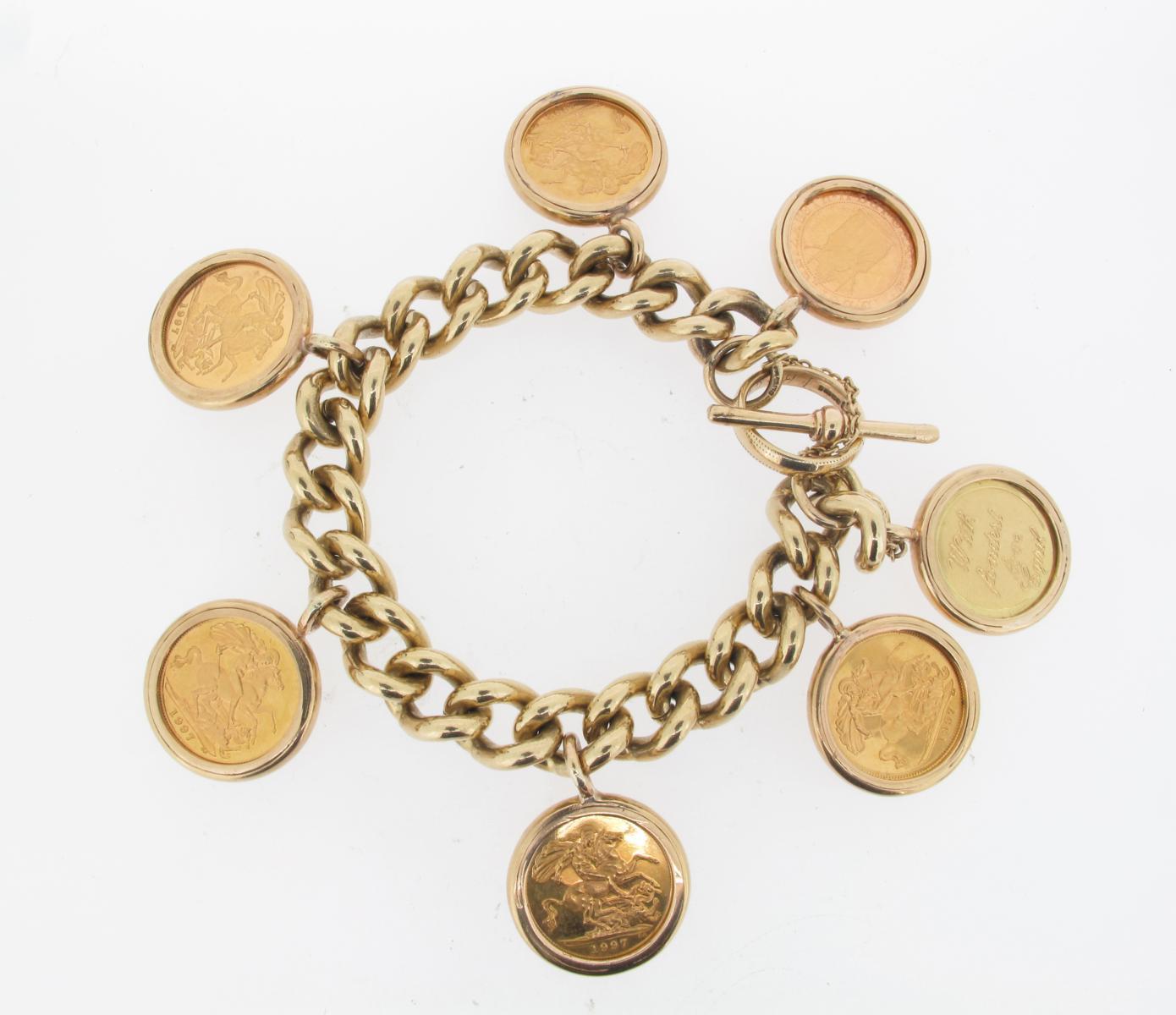 A gold curb link bracelet. With six gold mounted half sovereign pendants and another similar gold medallion pendant.