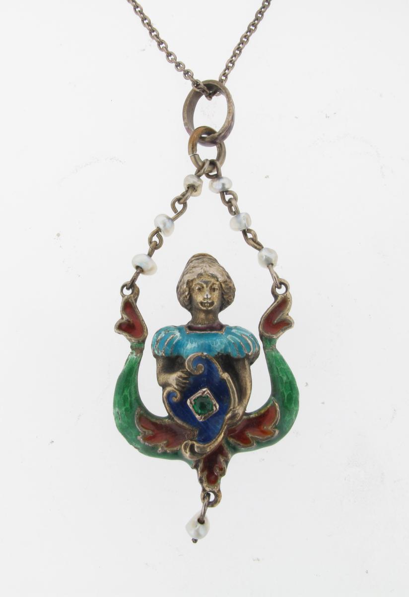 A late 19th Century Austro Hungarian pendant. Designed as a stylised mermaid with enamel decoration and seed pearls on a fine link chain.