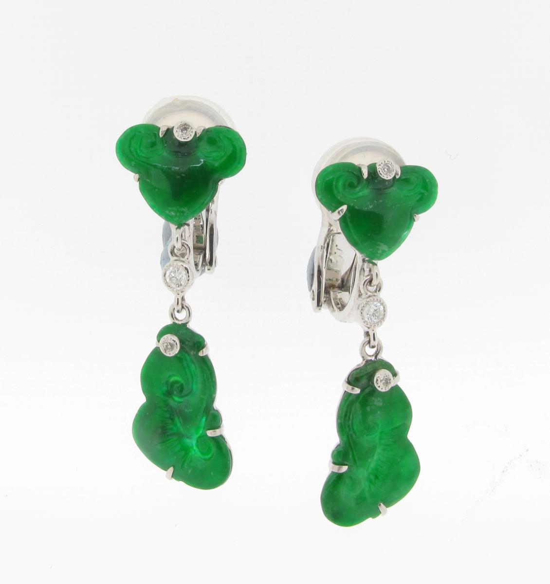 A pair of jade and diamond drop earrings, the carved jadeite sections are set with small circular cut diamonds in white gold.