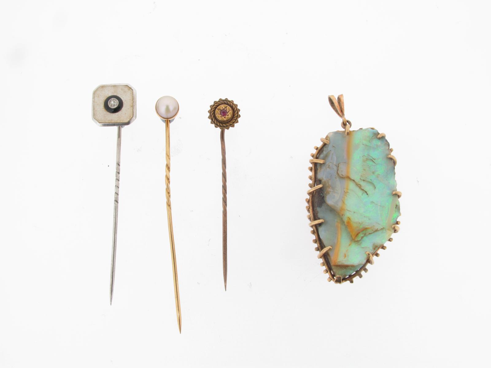 An opal pendant, the gold pendant is mounted with a section of boulder opal. And three stick pins.