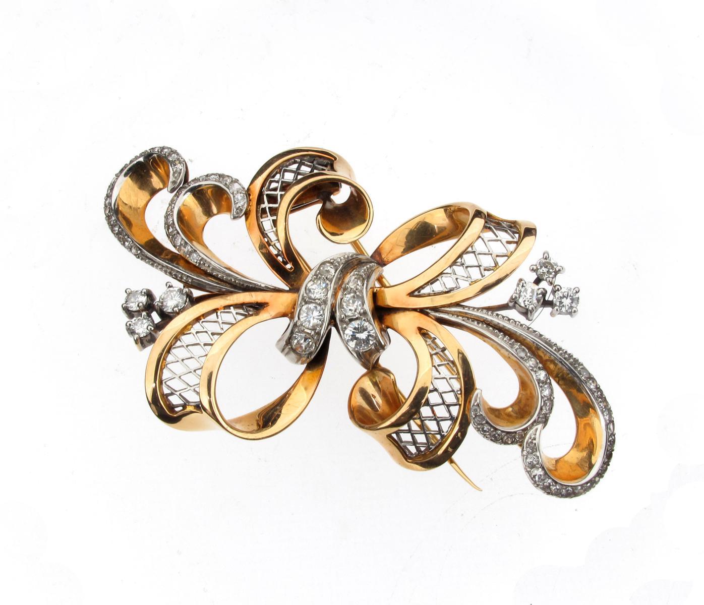 A diamond set gold stylised bow brooch. With lattice ribbons and diamond set scrolls in gold. 7cm wide. 22g.