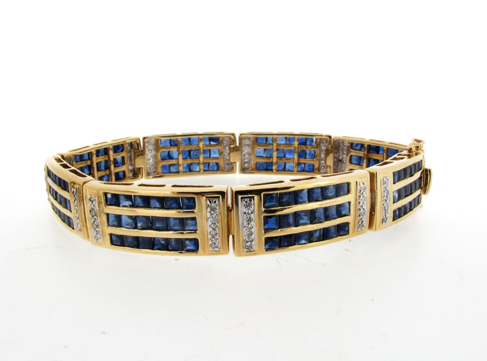 A sapphire and diamond set stylised gold gate link bracelet. 28g.