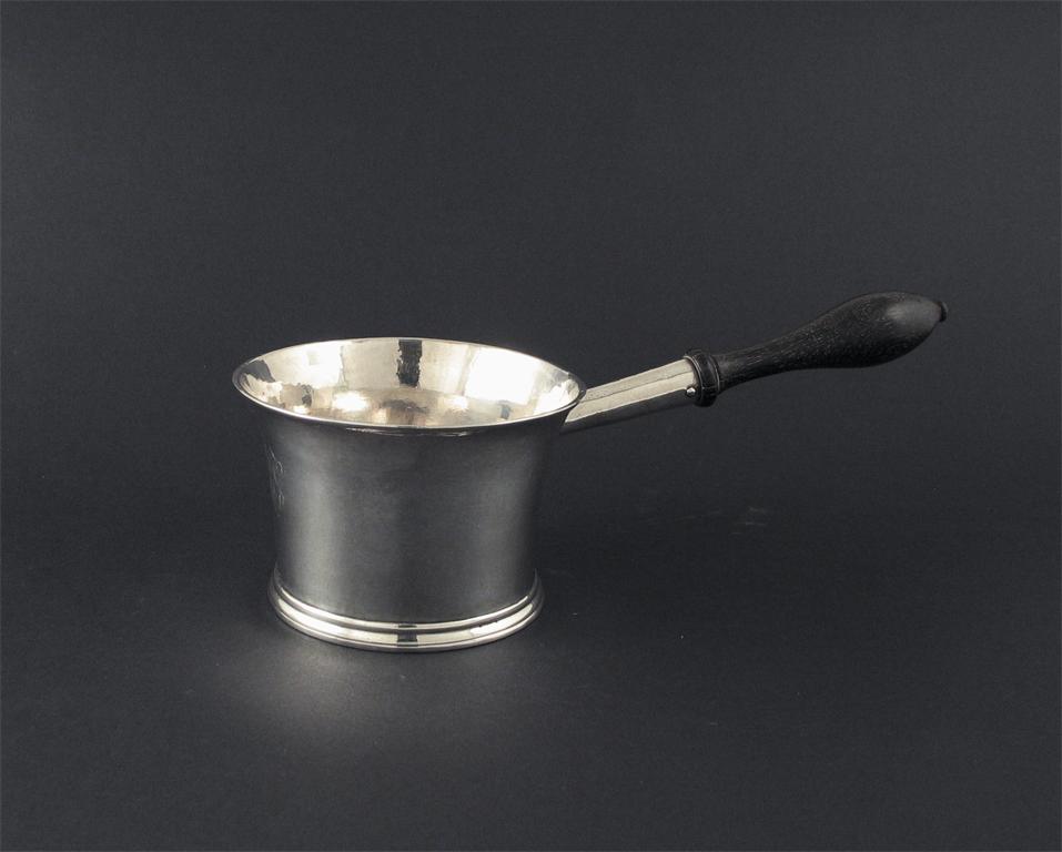 A George I brandy saucepan, with a flared bowl and a turned wooden handle , initialled by William Fleming, London 1719, 3.25in (8.2cm), 3.75oz.