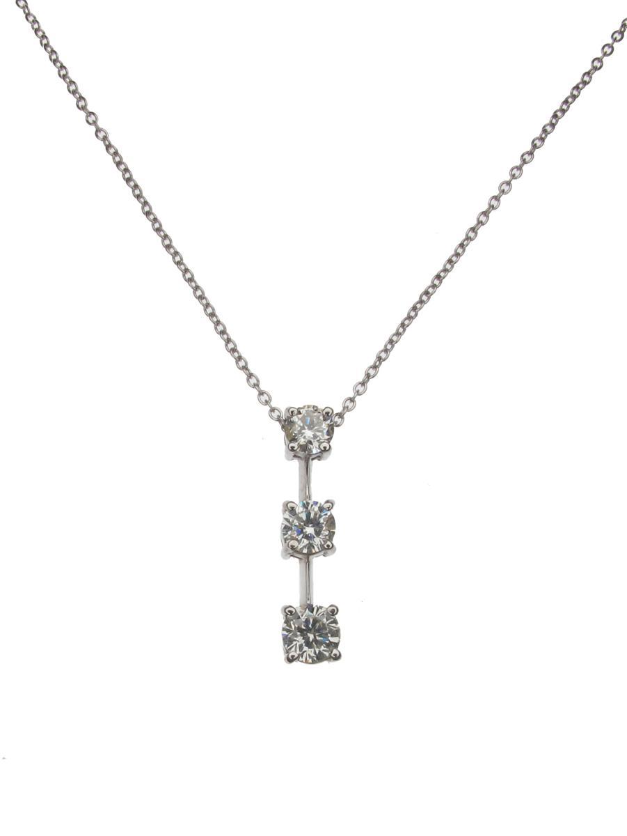 A diamond three stone pendant, the three circular brilliant cut diamonds are set in white gold on a fine link white gold neck chain.