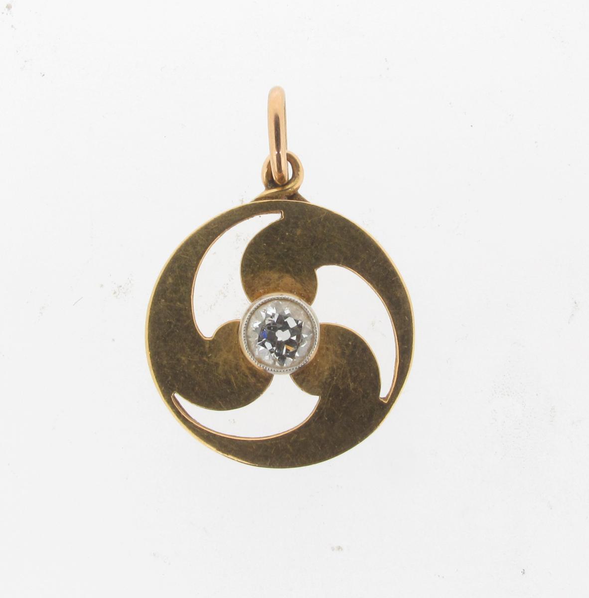 A diamond set pendant. The gold pendant is centred with a round brilliant cut diamond with inscription to the reverse dated 1929. 1.8cm wide.