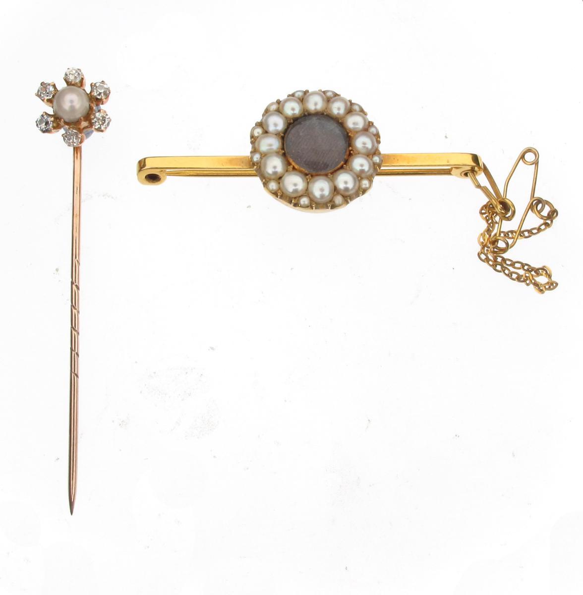 A pearl and diamond set gold stick pin and a pearl set gold locket brooch