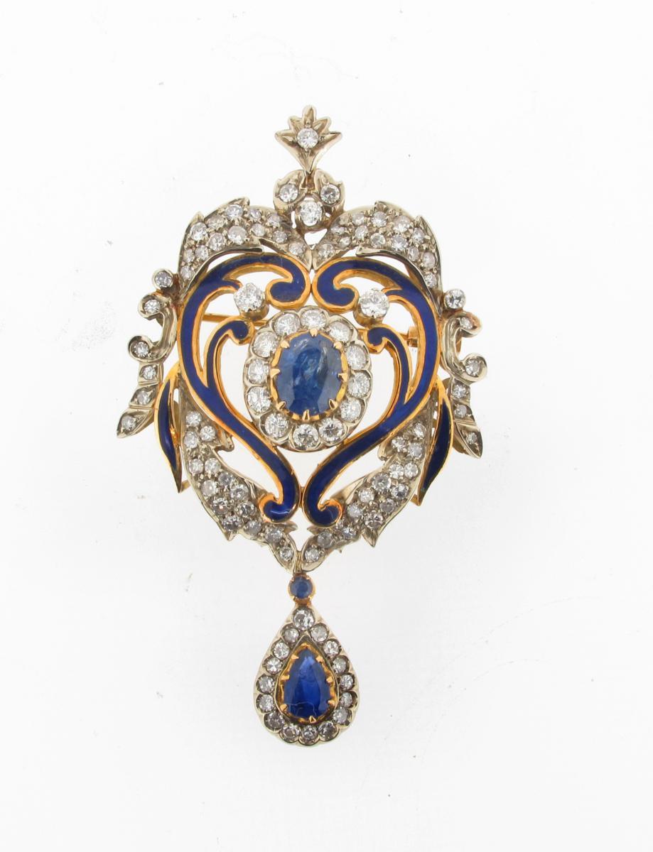 A sapphire and diamond scroll brooch pendant, with blue enamel decoration in silver and gold.