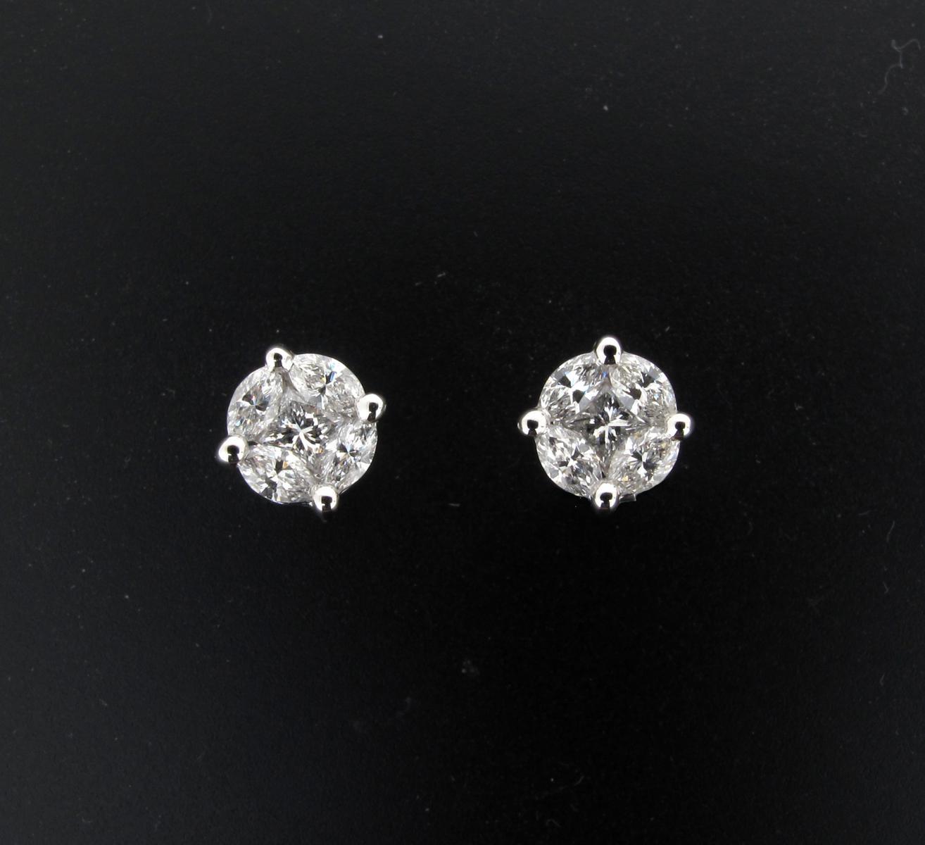 A pair of diamond stud earrings, each stud set with four marquise shaped diamonds and a centre square shaped diamond to the illusion white gold mount.