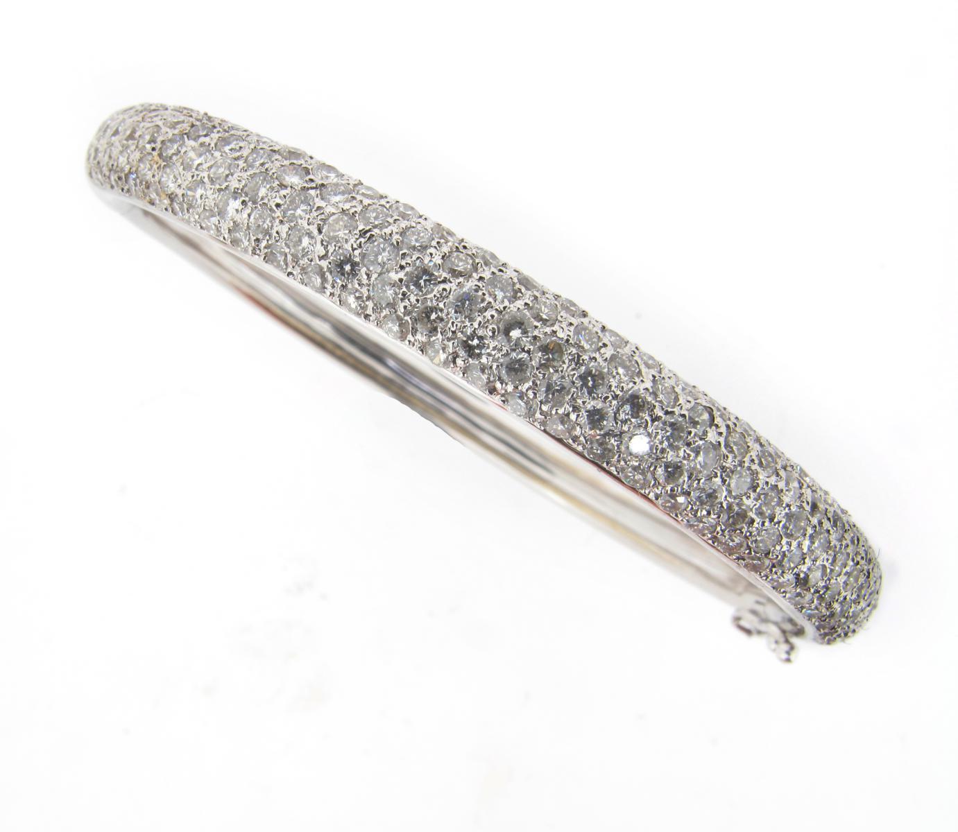 An 18ct white gold hinged bangle, pave set with small brilliant cut diamonds. 25g.