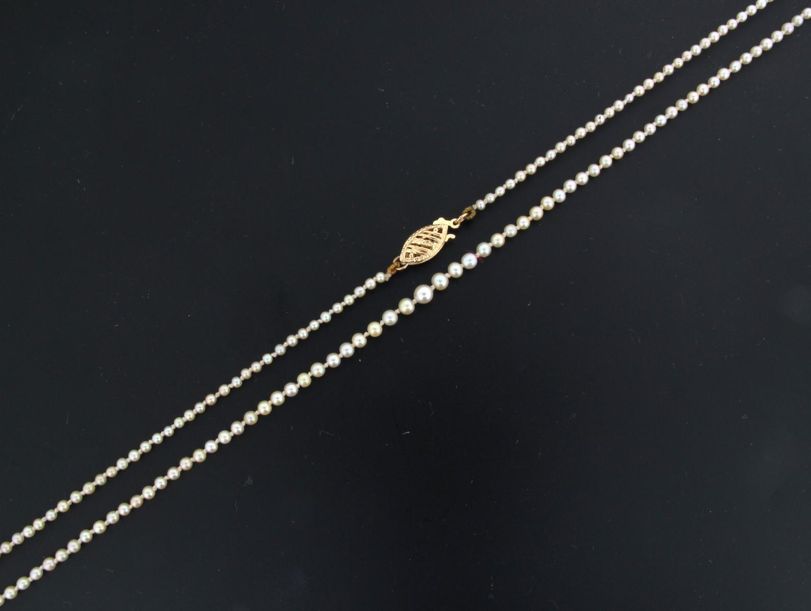 A seed pearl necklace, the graduated seed pearls with a yellow gold clasp. 50cm.