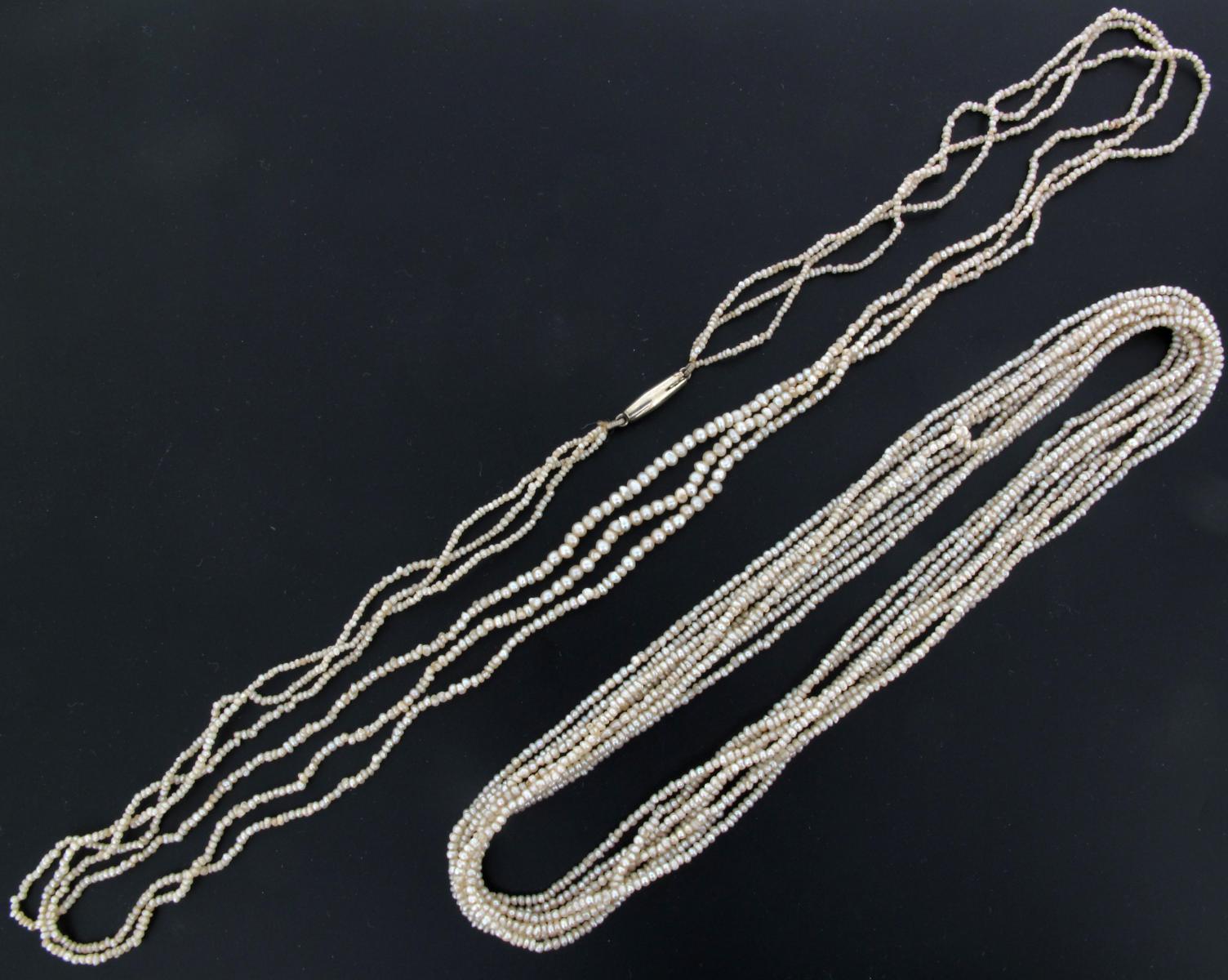 A three row seed pearl necklace (broken) and a seed pearl sautoir. 236cm.