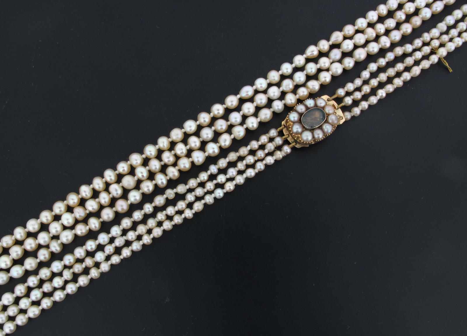 A three row pearl and cultured pearl necklace, the gold clasp mounted with pearls. With certificate number 1103/15 stating that the four tagged pearls are cultured, the remainder are natural.