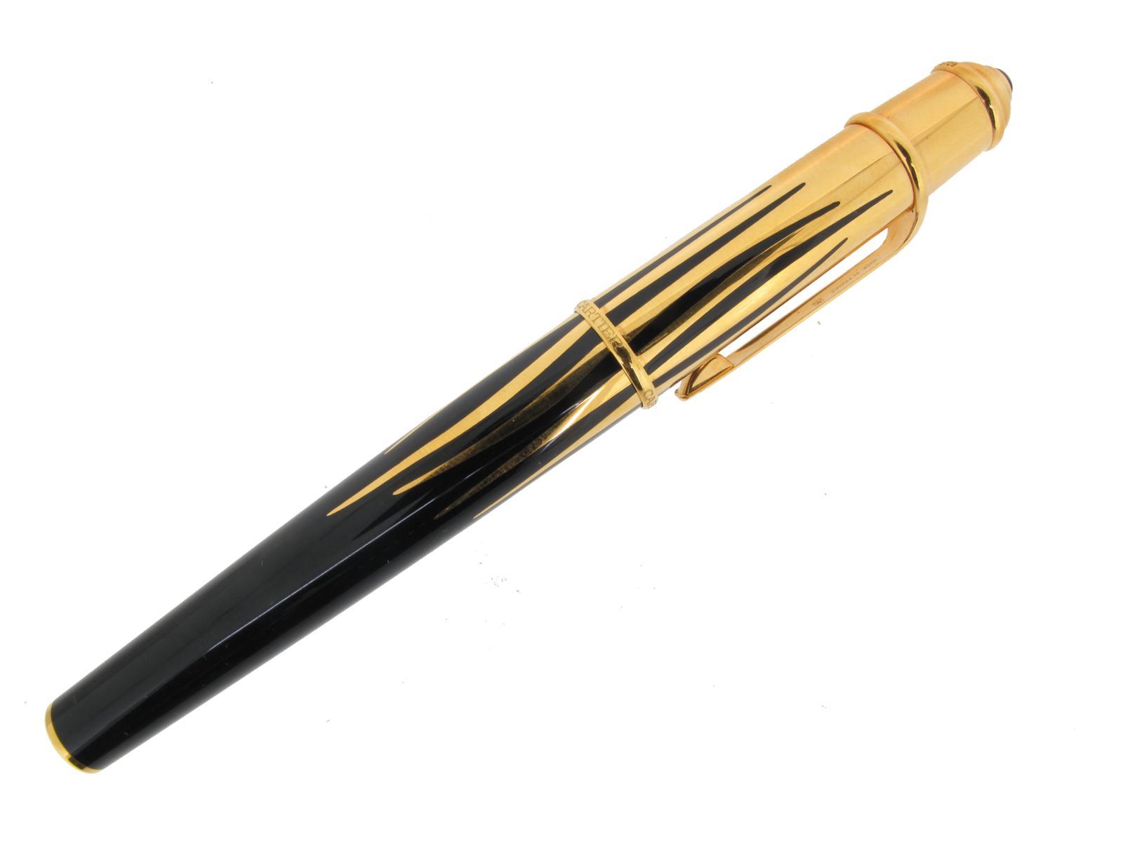 Cartier. A gold plated fountain pen with black enamel decoration and cabochon red stone terminals, cased.