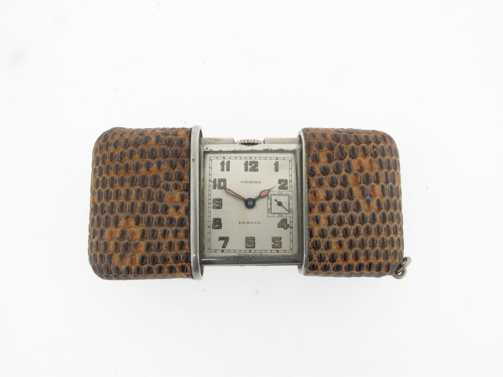 A Movado travel clock. Centre opening activating winding. Square signed dial with subsidiary...