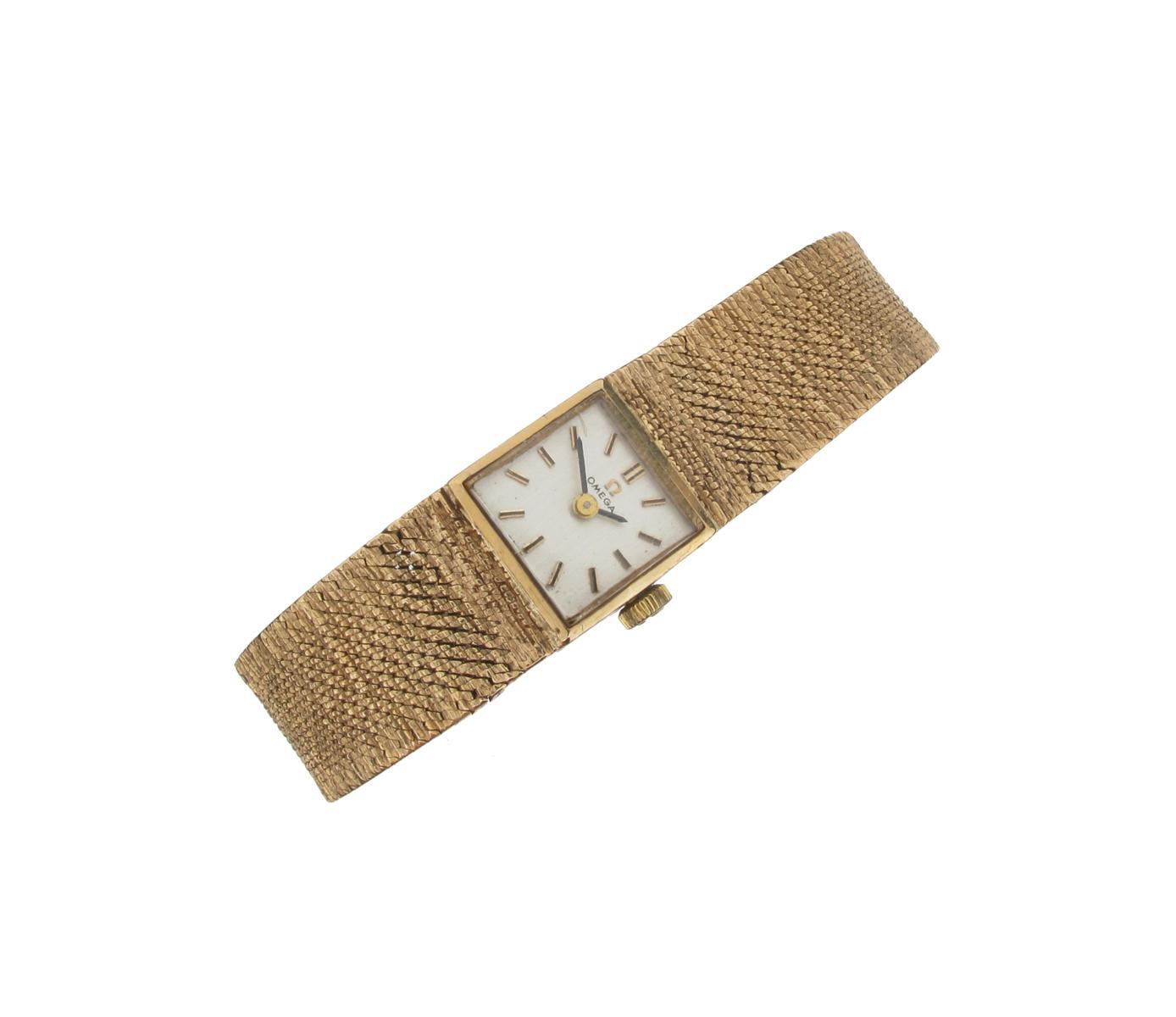 A ladies 9ct yellow gold wristwatch, the square white signed dial with baton numerals and integrated 9ct gold band. Omega case.