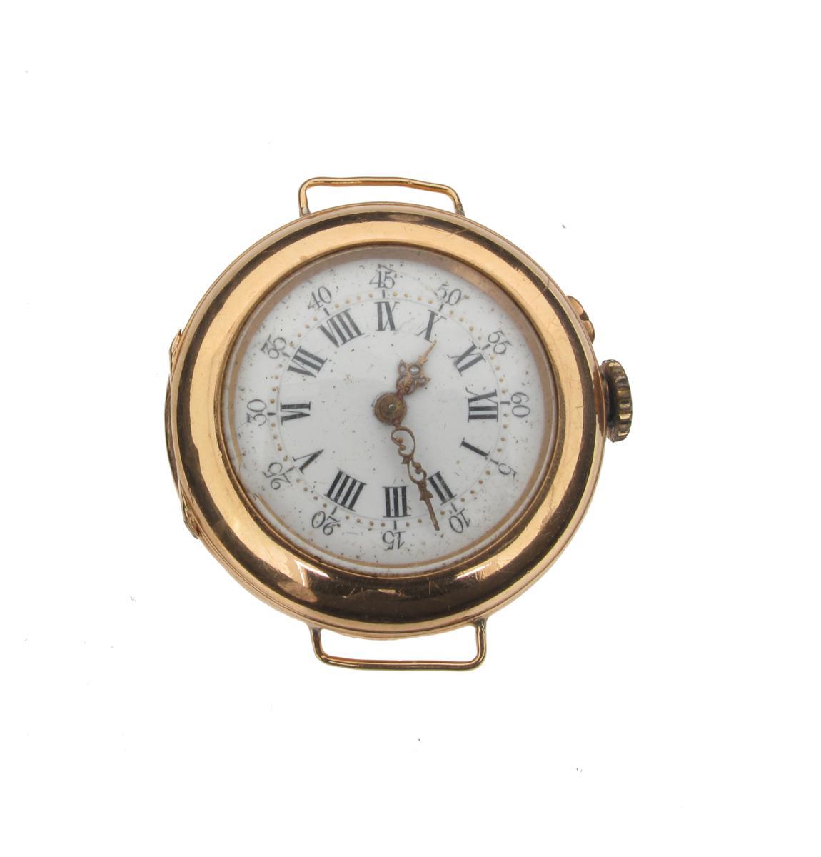 A ladies 18ct gold wristwatch, with black Roman hour numerals, the winder at XII.
