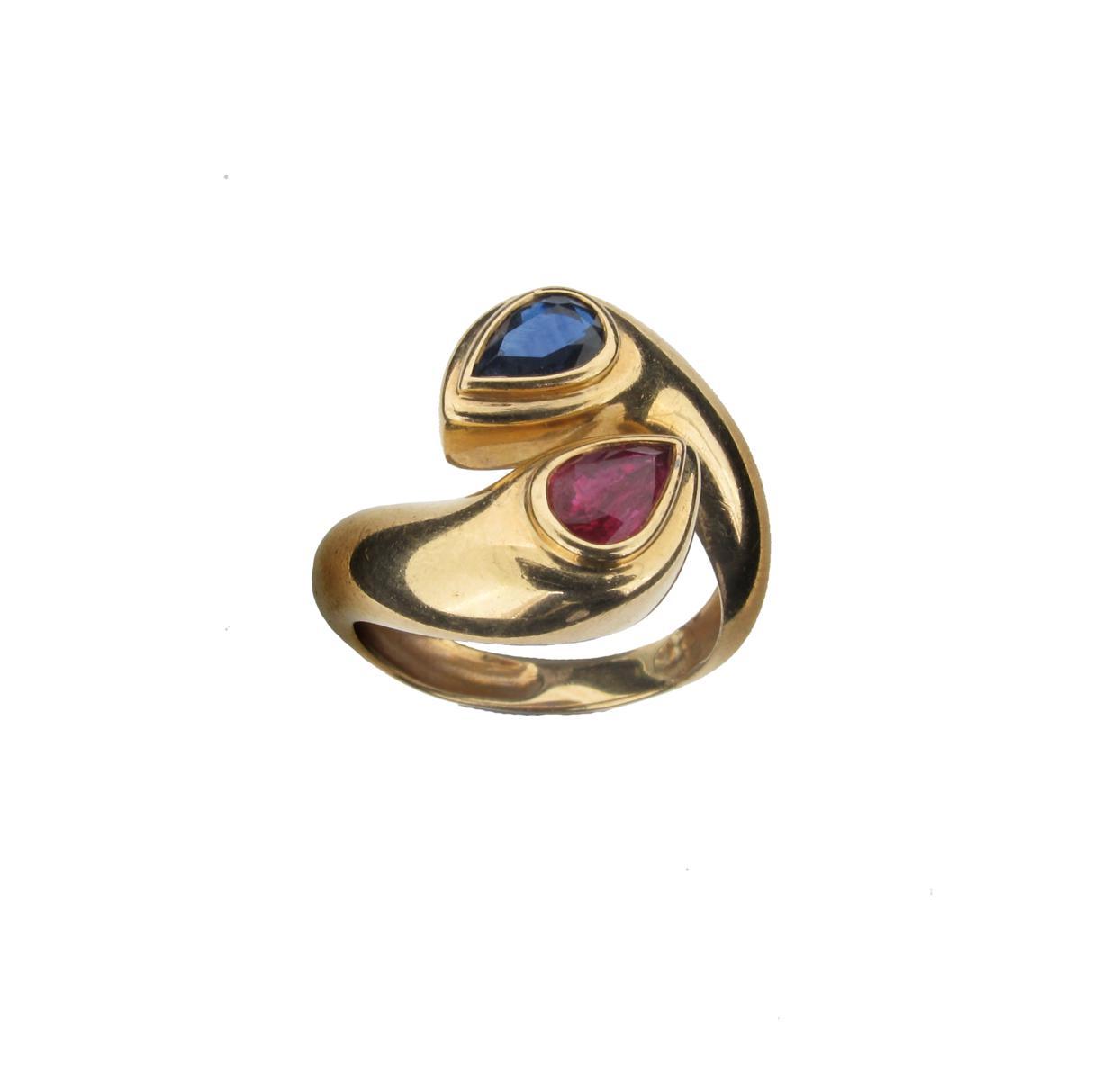 A sapphire and ruby cross over ring, set with a pear shaped ruby and sapphire in gold. Size N.