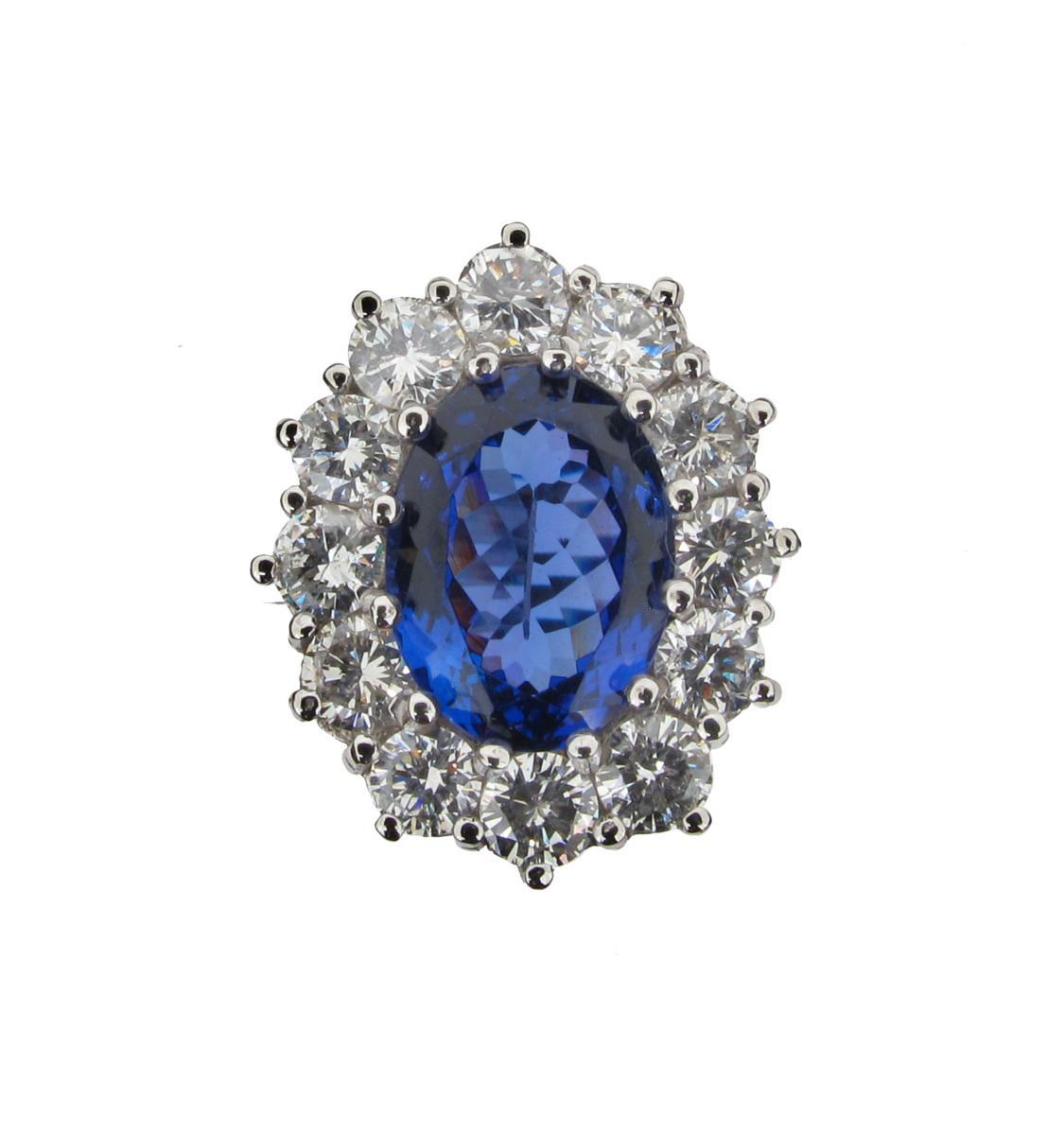 A tanzanite and diamond ring. The oval tanzanite is set within a surround of twelve circular cut diamonds in white gold. Size O 1/2.