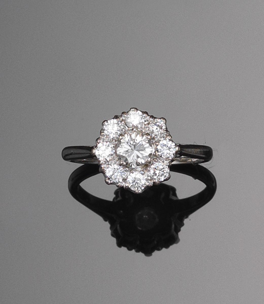 A diamond cluster ring. The centre round brilliant cut diamonds set within a surround of eight...
