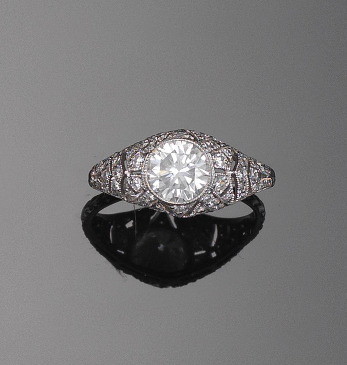A diamond cluster ring, the centre circular cut diamond is set in platinum and millegrain set with smaller diamonds to the shoulders. Size M 1/2.