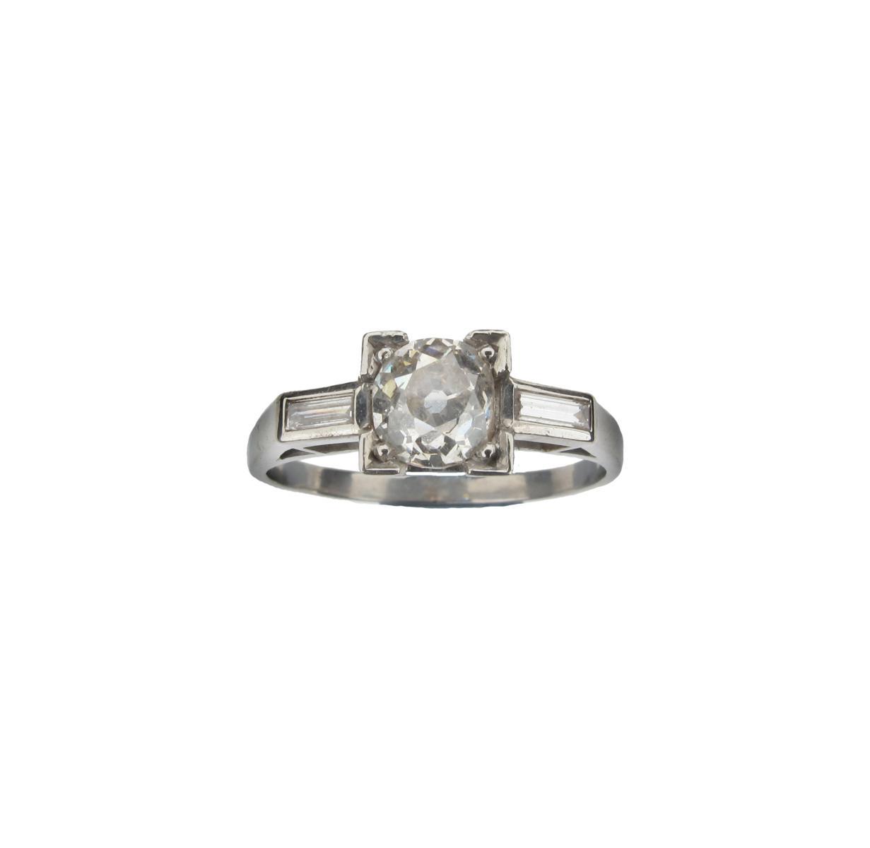 A diamond solitaire ring, the slightly cushion shaped diamond is set with two baguette shaped shoulder diamonds in white gold. Size M 1/2.