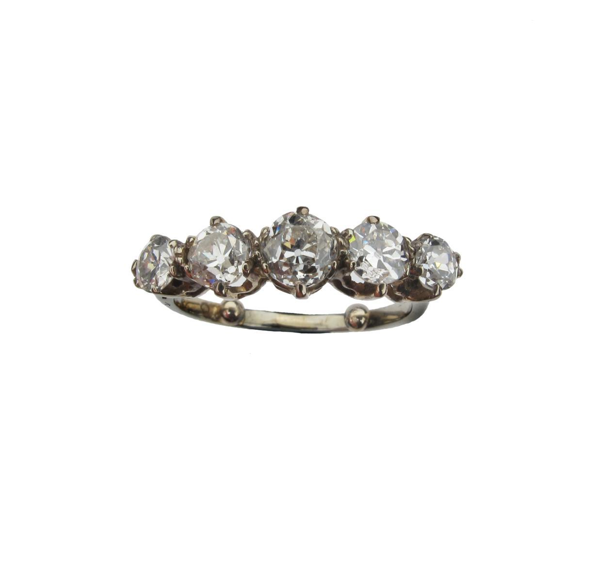 A diamond five stone ring, set with five graduated old circular cut diamonds in white gold. Size G (with size reducing pellets to the inner shank).