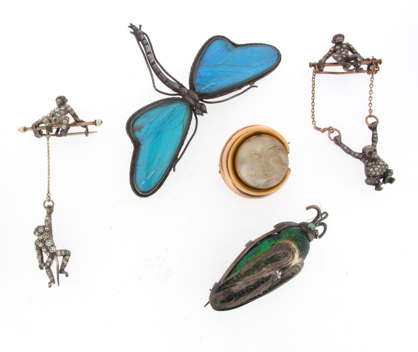 A monkey brooch, the monkey seated on a gold bar with pearl terminals and pave set with circular cut white pastes and green paste eyes. With another similar monkey hanging from a chain. Another similar brooch suspending a paste set silver orangutan, a silver dragonfly brooch mounted with butterfly wing, an iridescent green beetle with silver mounts and a gold mounted man in the moon brooch.
