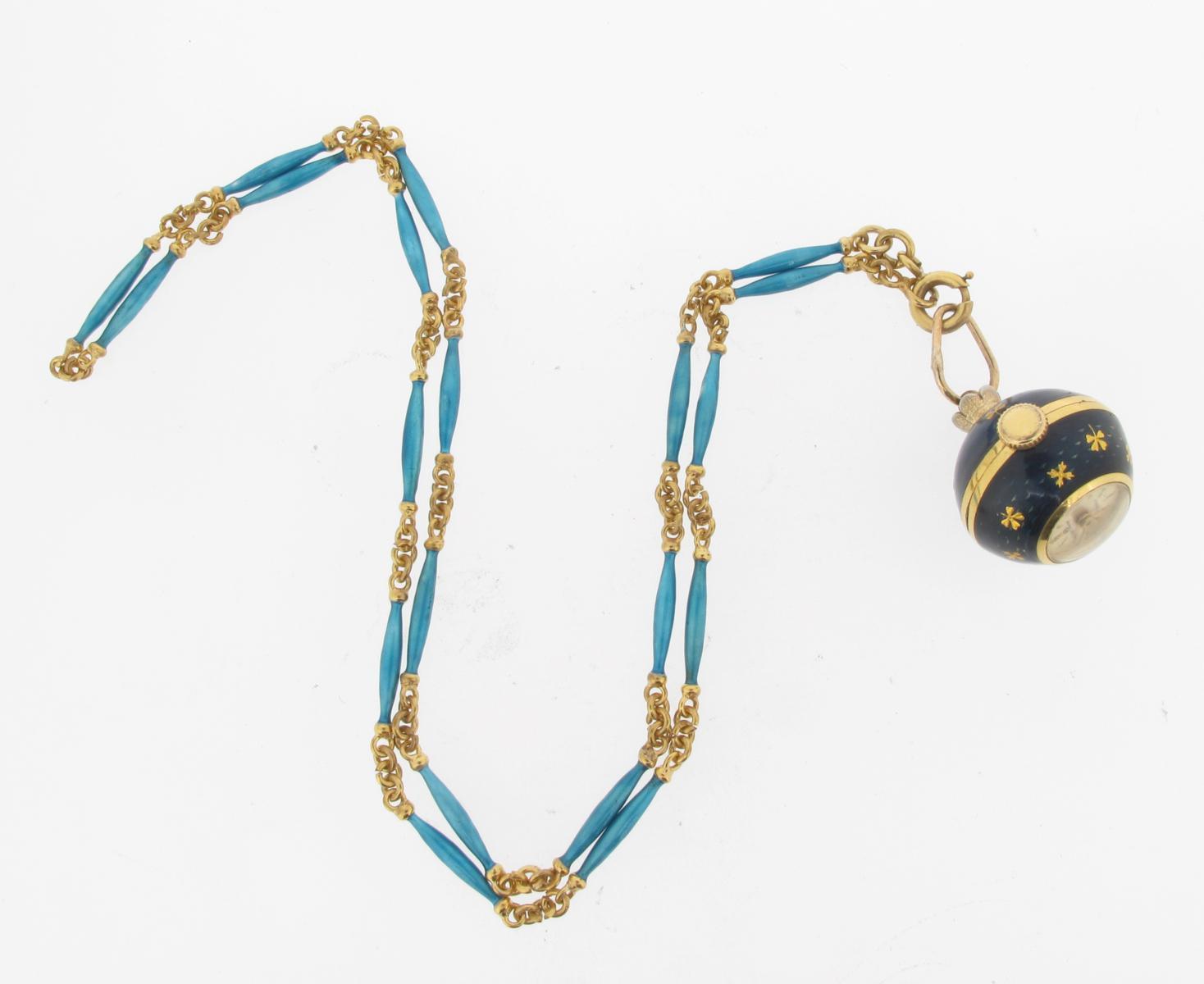 A pendant ball watch by Bucherer, with blue guilloche enamel decoration on a silver gilt neck chain with blue enamel decoration.