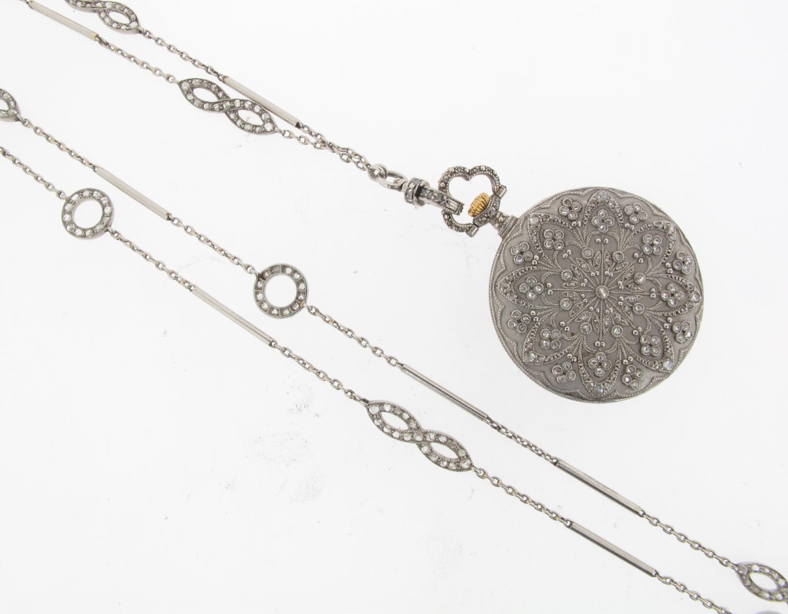 An early 20th Century diamond set platinum fob watch on long diamond chain. The plain cream...