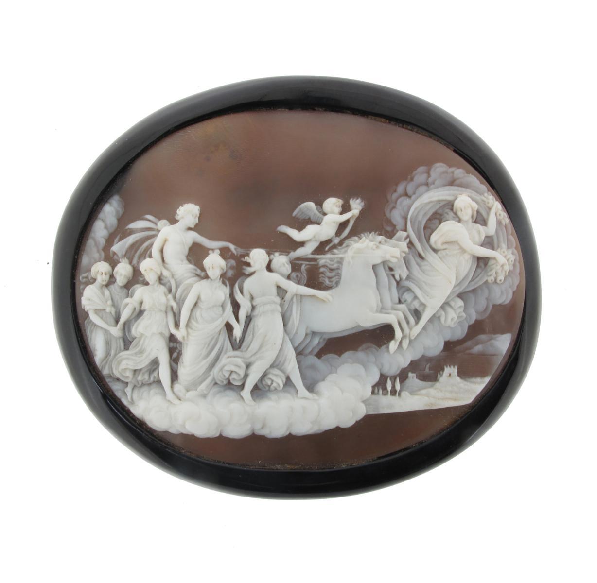 A carved shell cameo brooch. Well detailed and depicting Aurora's procession. With black frame. The cameo 6.5cm wide.