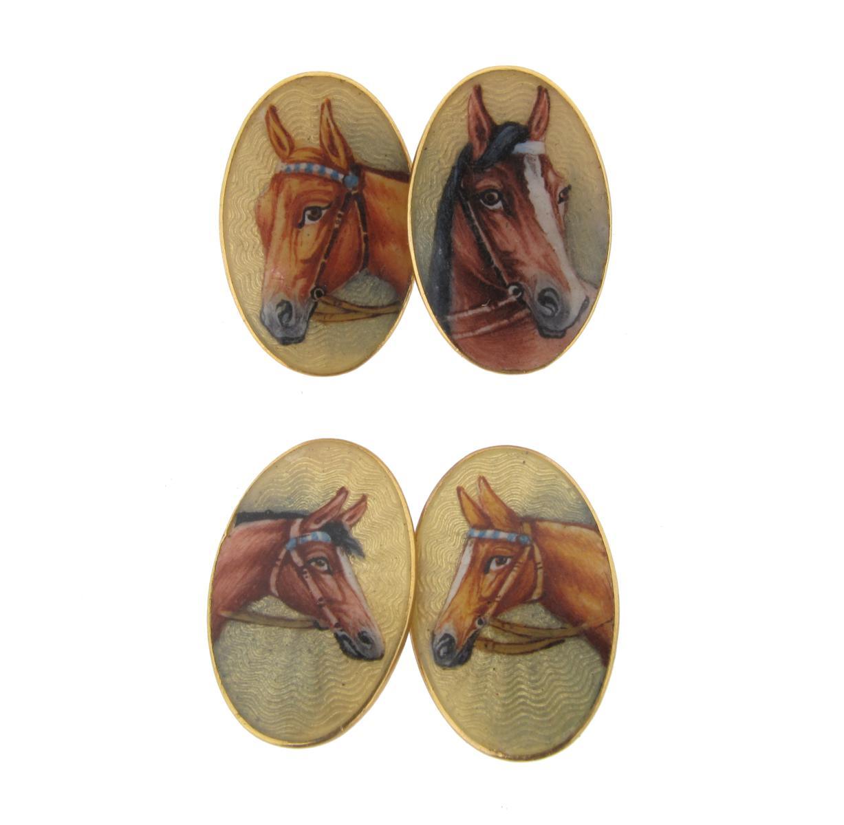 A pair of gold cuff links, each link painted with the head of a horse of yellow guilloche enamel ground. The horse with the white head band is believed to be Santa Claus, winner of the 1966 Epsom Derby.