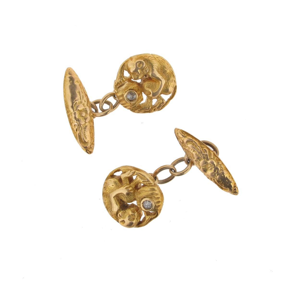 A pair of pierced circular cuff links in the form of a monkey clasping a circular cut diamond....