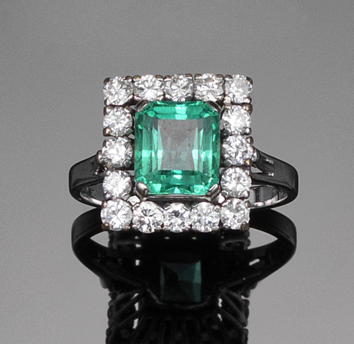 An emerald and diamond cluster ring, the emerald cut emerald is set within a surround of sixteen round brilliant cut diamonds in white gold. Size O 1/2.