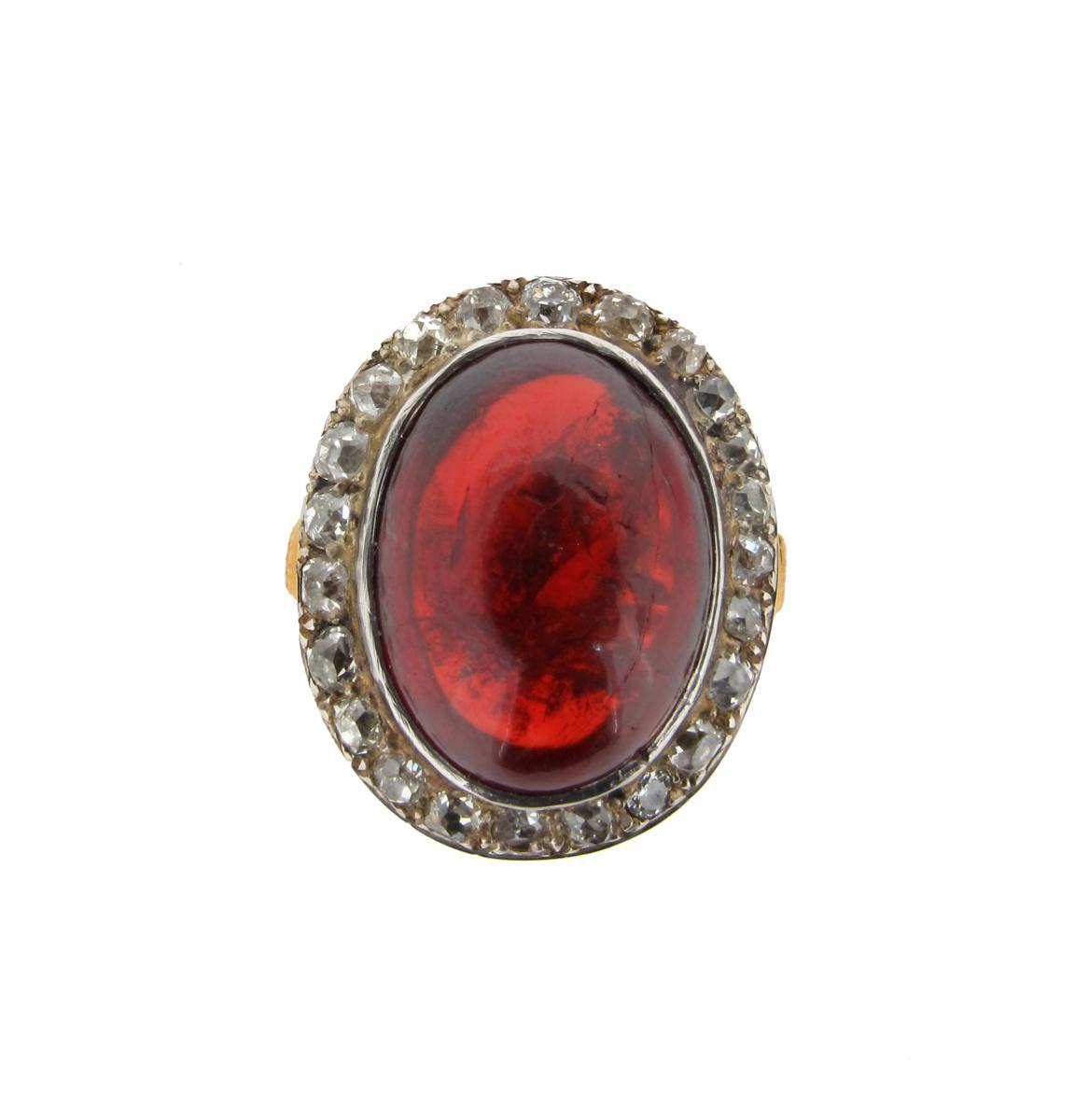 A garnet and diamond cluster ring, the cabochon oval shaped garnet is set within a surround of cushion shaped diamonds in silver and gold. Size O.