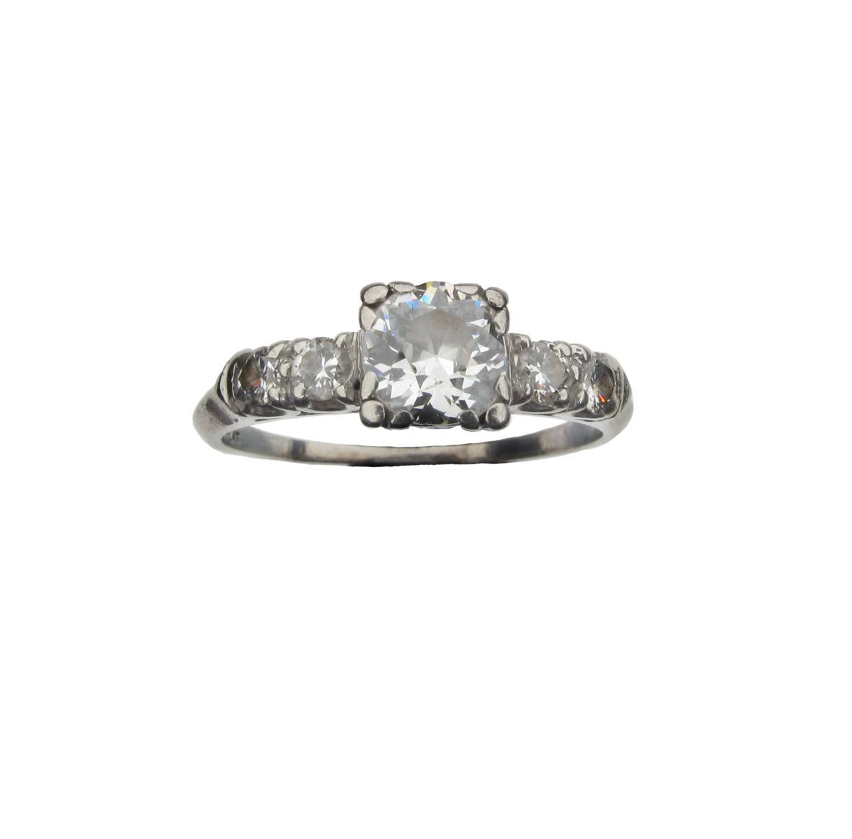 A diamond solitaire ring, the transitional round circular cut diamond is set with two smaller diamonds to each shoulder in platinum. Size Q.
