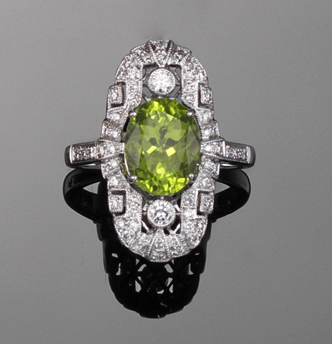 A peridot and diamond ring, the oval shaped peridot is set with small brilliant cut diamonds in white gold. Size L 1/2.