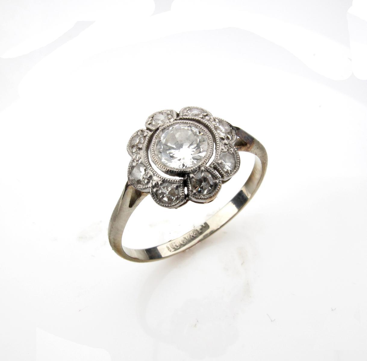 A diamond cluster ring, the centre circular cut diamond is millegrain set within a surround of smaller diamonds in white gold and platinum. Size M 1/2.